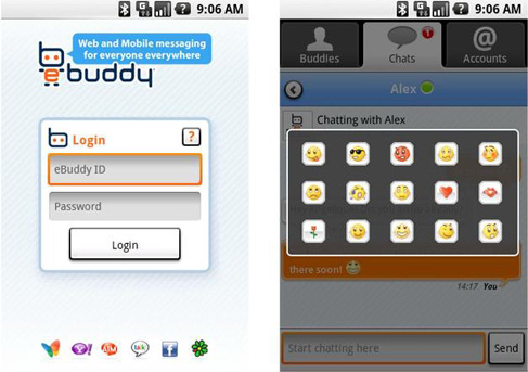 O aplicativo mais popular de msn para Android não deixa a desejar em nada, o eBuddy mesmo apresentando tantas opções, é super simples de usar, o seu diferencial em comparado a versão de browser é a obrigação da pessoa fazer uma conta, que é feita pelo celular mesmo na primeira vez que a pessoa utiliza o aplicativo.